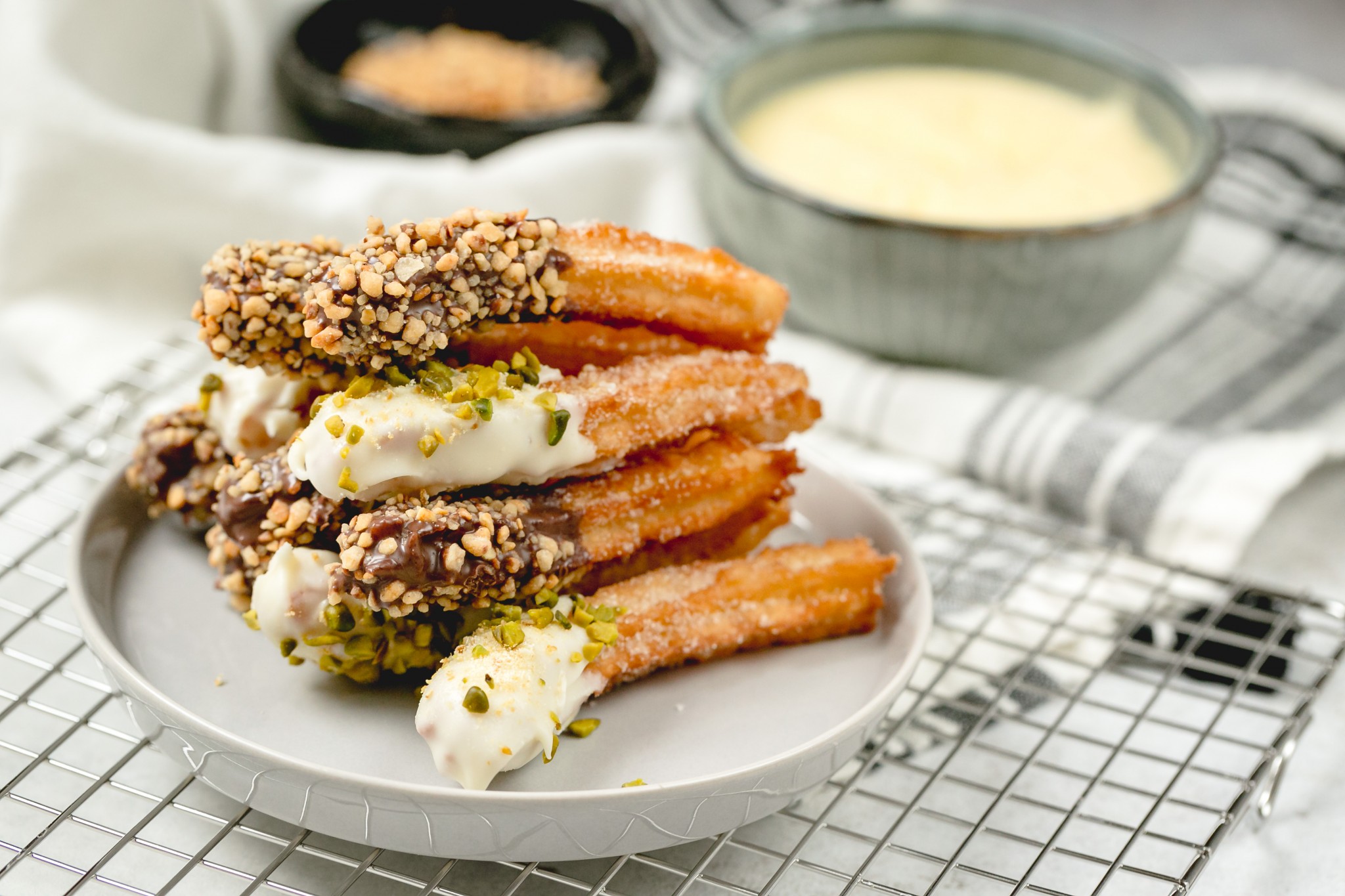 - Zitronenzucker, Zimt und Kristallzucker mischen und die fertig gebackenen Churros darin wälzen. Dann die Spitze der Churros in weiße Schoko und Vollmilch Schoko Glasur dippen auf ein Backgitter legen, Haselnuss Krokant und Pistazien darüber streuen und noch etwas Zitronenzeste über die Churros mit weißer Schokoglasur rieseln lassen. Wer keine Lust auf die Glasuren hat nimmt am besten die Dr. Oetker Vanille Paradies Creme und verwendet es einfach als Dip, die Schoko Version funktioniert natürlich auch!